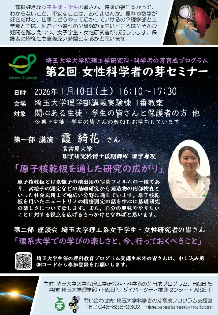 第一部では、実験物理学分野で活躍中の女性研究者の霞さん(本学理学部物理学科卒)のセミナーを企画しました。また第二部では現役女子学生の皆さんを交えて、多角的に?皆さんの「今とこれから」を考えていきたいと思います。